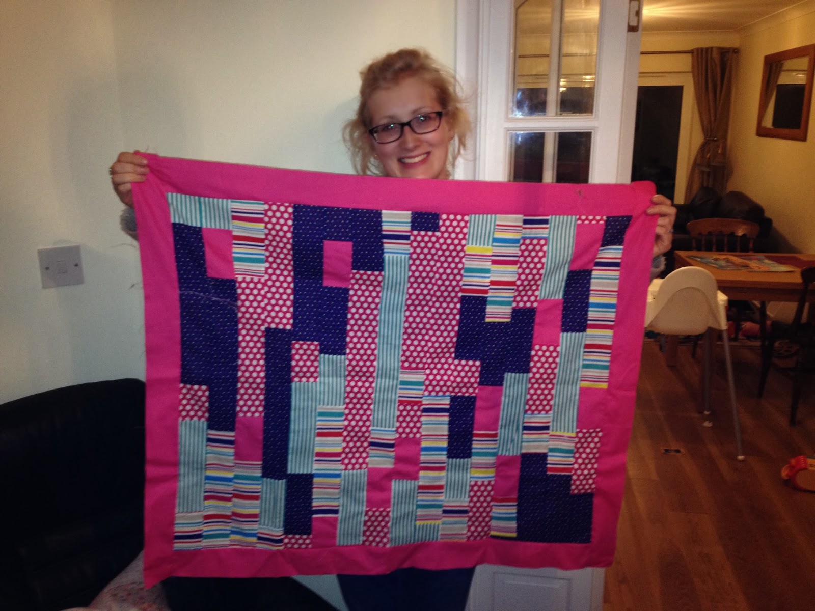We started by cutting lots of strips of fabric the same width, but different lengths and then sewed them together end to end until we had a really really long strip of fabric (and I mean giant!). We then folded the giant strip in half and sewed it together. This was repeated (with seams ironed flat in between) until we had something resembling a quilt. Here’s me with mine: