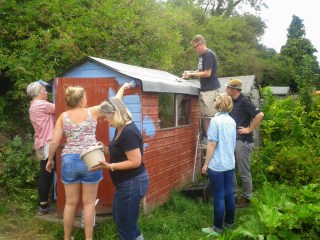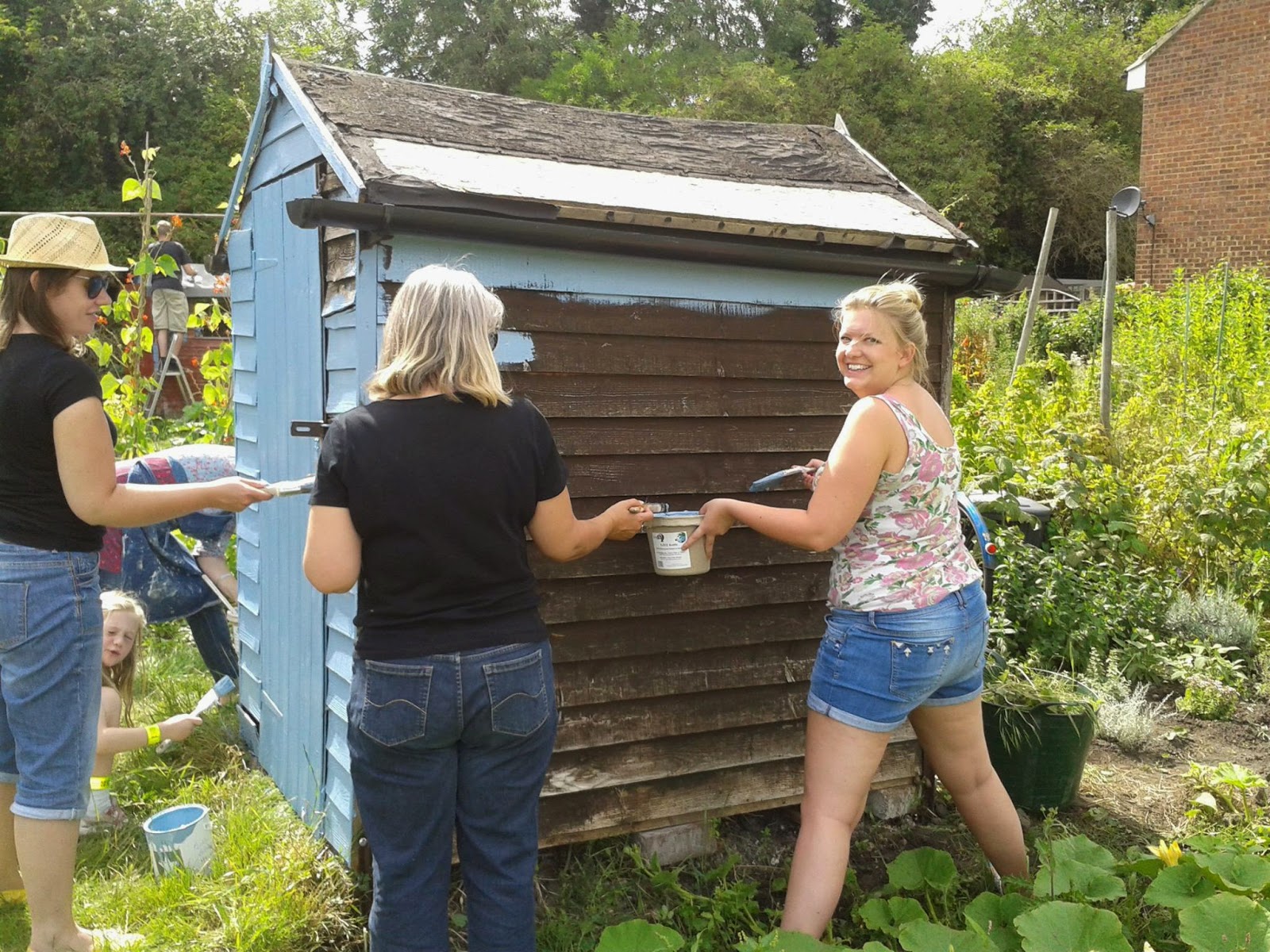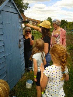 With a specially mixed paint (now lovingly named Blue Belle blue!), mixed by Blue Belle Kathy (who by the way, owns the most FAB shop in Cambridge, Providence), Belles and their families gathered on our Dig for Denman allotment to slap on some lashings of light and blue to rival even the bluest of skies!