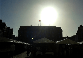 | From Flickr – the rainbow pride flag flies high about the Guildhall in Cambridge every February |