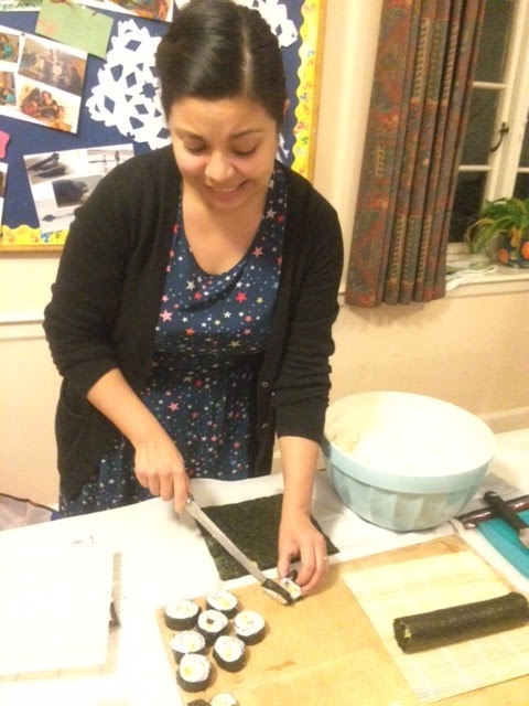 | Kara carefully placing her sushi out after its first wrap and chop! |